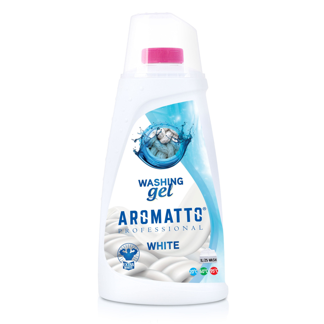 Żel do prania białego Aromatto bez chloru. Gwrantuje zachowanie idealnej bieli pranych rzeczy, dzięki czemu pozostaną długo jak nowe.